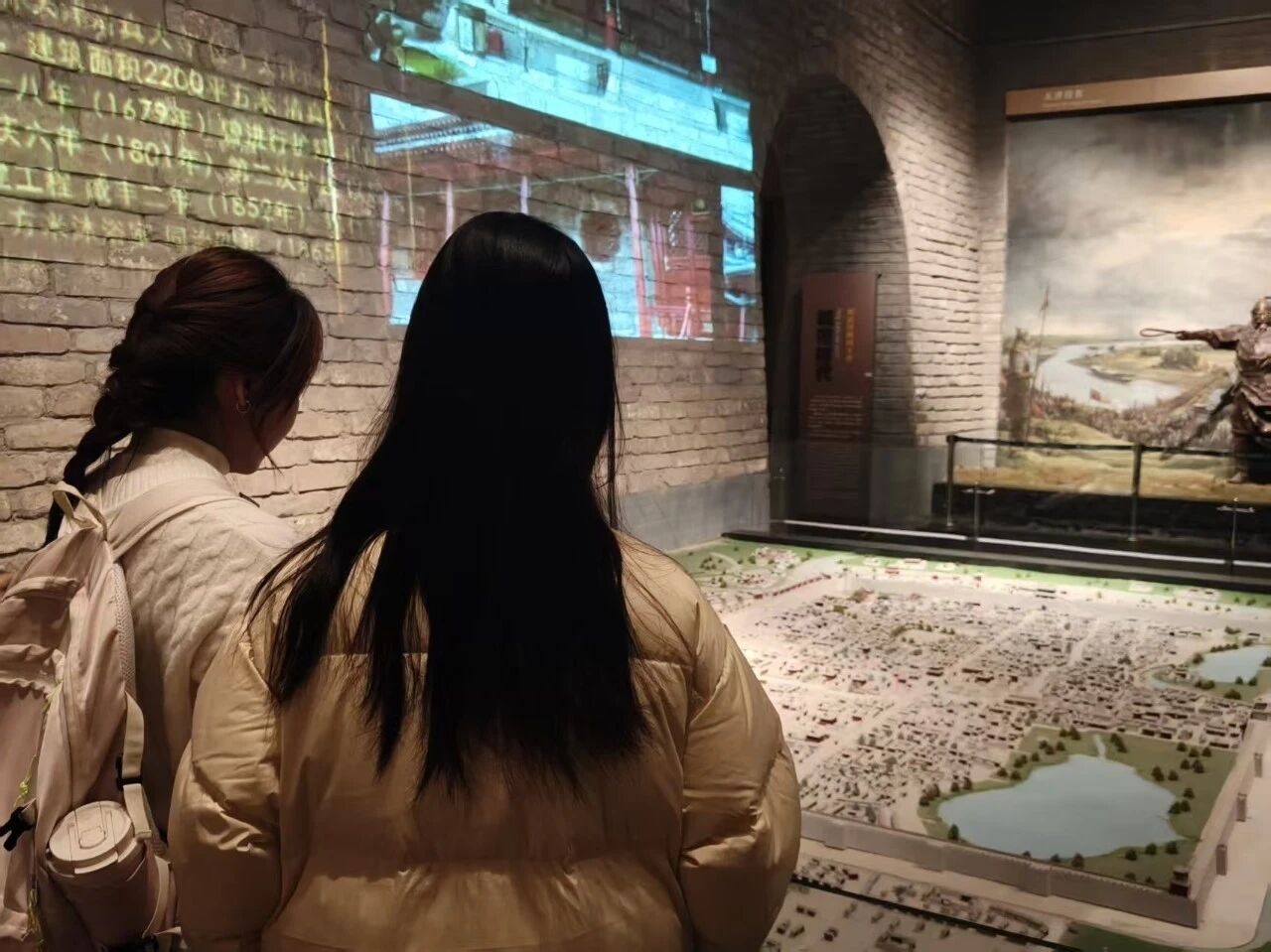 在参观天津博物馆的过程中,学员们分组自主参观各个主题展厅,跟随志愿者生动的讲解,仿佛重新走过展品所处的时代,讲解的声音与求知的目光交汇,重新绘就出动人心弦的历史图景:在“商邑百工”青铜器与玉器展厅了解古代精湛的铸造与琢玉工艺,感悟其所承载的礼制文化与精神信仰;经过古代书画展厅,直观感受中国传统书画的笔墨神韵与意境,提升对古典艺术的鉴赏能力;在参观抗日战争八十周年纪念馆,直面民族苦难与抗争历史的过程中,深刻理解抗日战争对于重塑民族精神、奠定国家独立基石的转折意义,激发内心维护和平,矢志强国的不竭动力。