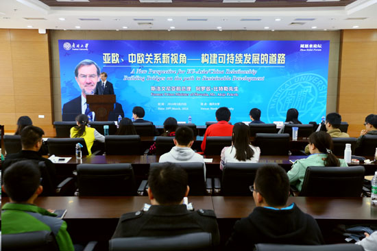 阿罗兹·比特勒围绕“亚欧、中欧关系新视角——构建可持续发展的道路”进行了讲座。他从历史、经济、文化、地理环境等方面简要介绍了斯洛文尼亚的基本概况和发展现状。随后向在场师生分享了亚欧、中欧共同发展的观点与看法。他表示,领导者应遵循成长与发展的规律,领导者对一个国家及地区的可持续发展将产生重要影响。世界是一个“地球村”,牵一发而动全身,因而所有的领导者都有责任维护世界的和平与发展。如果不断地向一个气球“充气”,它就会爆炸,因而要遵循事物发展的规律,这是一个国家、国家与国家之间健康、绿色、和谐发展的前提与基础。阿罗兹·比特勒高度赞扬了中国近年来发展建设取得的成就,他认为中国的“一带一路”将有利于中欧国家及地区的共同繁荣、发展进步,期待在中欧的共同努力下,能够达到国家及地区间的绿色合作,构建一个美丽的、可持续发展的世界。