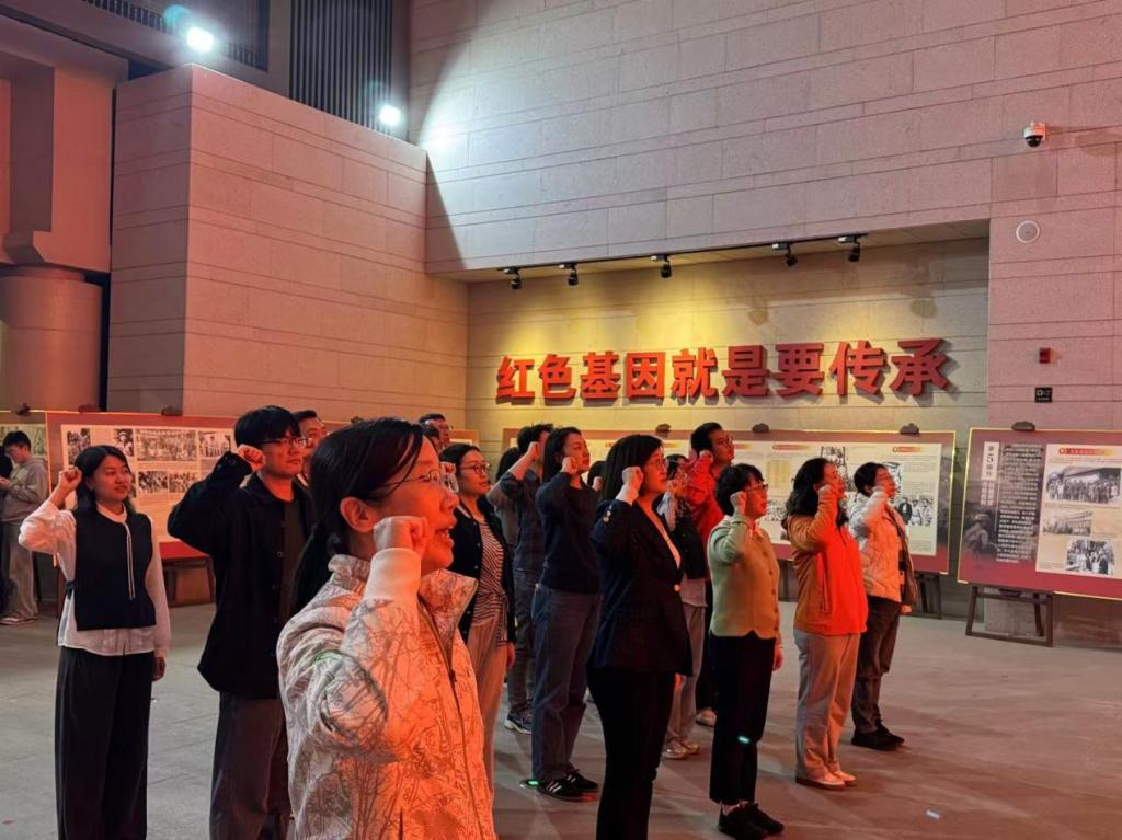活动最后一站来到铁道游击队纪念馆。纪念馆采用“碑馆合一”的独特建筑布局,馆内陈列的54米长老式蒸汽机火车成为最引人注目的展品。师生们依次参观“抗日烽火燃鲁南”“初露锋芒显身手”“铁道飞虎出奇兵”等6个单元展区,通过实物、图片、多媒体影像等多元形式,全面回顾铁道游击队“扒火车、搞机枪、炸桥梁”的传奇抗战历程,同时了解枣庄人民发扬铁道游击队精神、推动区域改革发展的当代实践。参观结束后,参加活动的全体党员在纪念馆大厅整齐列队,面向鲜红党旗庄严宣誓:“我志愿加入中国共产党,拥护党的纲领,遵守党的章程……”铿锵誓言在馆内久久回荡,既是对革命先烈的深切致敬,也是对初心使命的郑重重申。